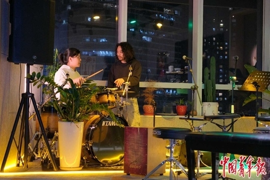 12月4日,北京市朝陽區(qū)望京的一處寫字樓里,夜校老師、樂隊鼓手老萬(右)在為一名學(xué)員講授架子鼓課程,她是一名零基礎(chǔ)學(xué)員。中青報·中青網(wǎng)見習(xí)記者 田嘉碩/攝