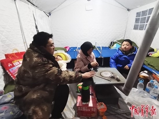 12月19日晚,甘肅省積石山縣大河家鎮(zhèn)一處安置點(diǎn),30歲的馬繼云一家在安置點(diǎn)帳篷里烤火爐。當(dāng)天他們收到了政府和愛心企業(yè)提供的生活物資,把一家人的生活安頓了下來。中青報(bào)·中青網(wǎng)記者 馬富春/攝