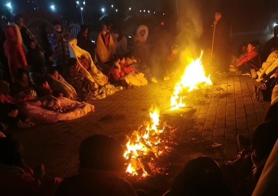 12月19日凌晨,積石山縣高關(guān)初級中學(xué)的學(xué)生圍坐烤火。受訪者供圖
