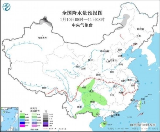 全國降水量預(yù)報圖(1月10日08時-11日08時) 來源:中央氣象臺網(wǎng)站