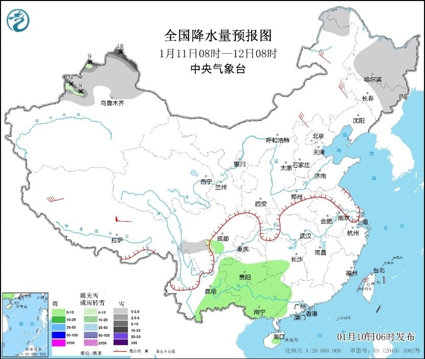 預計10-12日,新疆北部多降雪,降雪量以小到中雪為主,阿勒泰、塔城、伊犁河谷等地部分地區(qū)有大到暴雪,局地大暴雪。此外,10日夜間到11日,內(nèi)蒙古東北部、黑龍江、吉林等地的部分地區(qū)有小雪。
