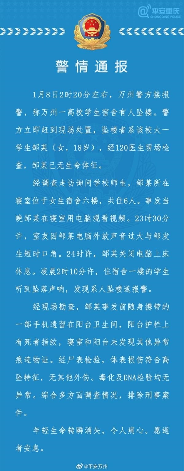 ·重慶警方通報(bào)大一女生校內(nèi)墜樓身亡:排除刑事案件,此前曾與室友發(fā)生口角。