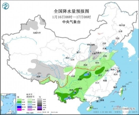 1月16日08時(shí)至17日08時(shí),新疆北部、西藏中東部、青海南部、陜西中北部、華北南部和西部、黃淮西部和北部、川西高原、云南西北部等地部分地區(qū)有小到中雪或雨夾雪。黃淮南部、江淮大部、江漢、湖南西部和北部、西南地區(qū)大部、廣西西部等地部分地區(qū)有小到中雨,其中,湖北西南部、重慶東北部、云南南部等地局地有大雨(25~45毫米)。內(nèi)蒙古中部、遼東半島等地部分地區(qū)有4~5級風(fēng)。南海中北部海域?qū)⒂?~7級風(fēng)、陣風(fēng)8~9級。