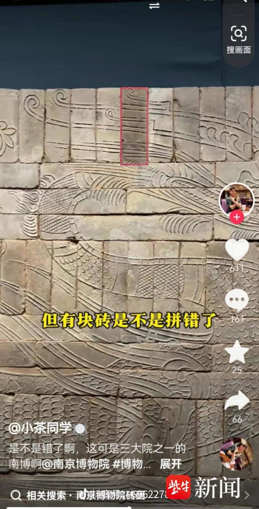 “家人們,我好像在南博發(fā)現(xiàn)了一件展品有一處錯誤”,網(wǎng)友“小茶同學(xué)”發(fā)視頻表示,“1月25日去南京博物院游覽,在看到《羽人戲龍磚畫》時,發(fā)現(xiàn)磚畫很精美,保留很完整。磚畫上的陽刻線條尤其讓我感到震撼,看到深色磚的部分,我感覺有點(diǎn)別扭,當(dāng)時就臆想著那塊磚反過來是不是更好一點(diǎn),于是發(fā)了一個視頻求助。”