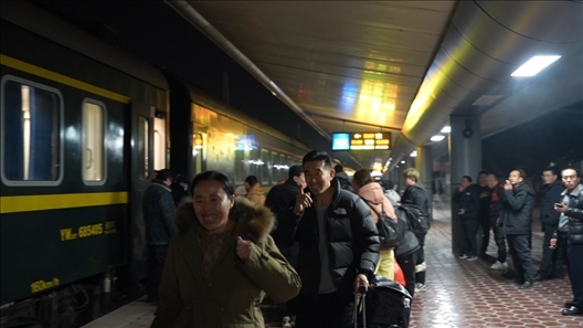 14號車廂內(nèi),來自黑龍江省齊齊哈爾市泰來縣的王興海和陳玉倩望著車窗外、站臺上的王靚怡,喜笑顏開。跨越2700多公里、歷時52個小時,只為給女兒一個驚喜,陪她在崗過年。