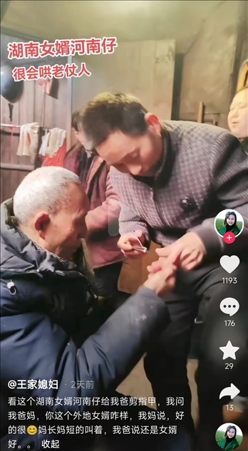 還有的女婿“眼里有活”,去了丈母娘家什么都干,修燈泡、放牛、做飯、打麻將,入鄉(xiāng)隨俗無所不能,深受丈母娘好評(píng)。