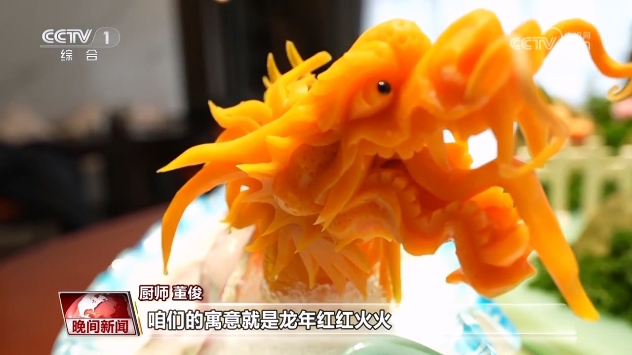 廚師 董俊:把魚(yú)切成薄片,用濃湯涮熟,擺盤(pán)呈現(xiàn)一條龍的造型,咱們的寓意就是龍年紅紅火火、風(fēng)調(diào)雨順、年年有余。
