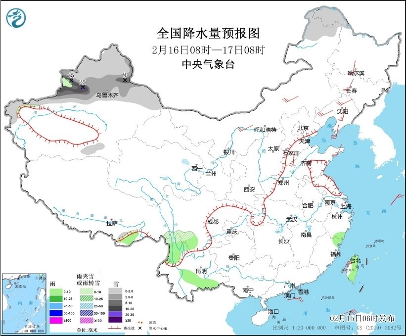 圖3 全國降水量預(yù)報圖(2月15日08時-16日08時)