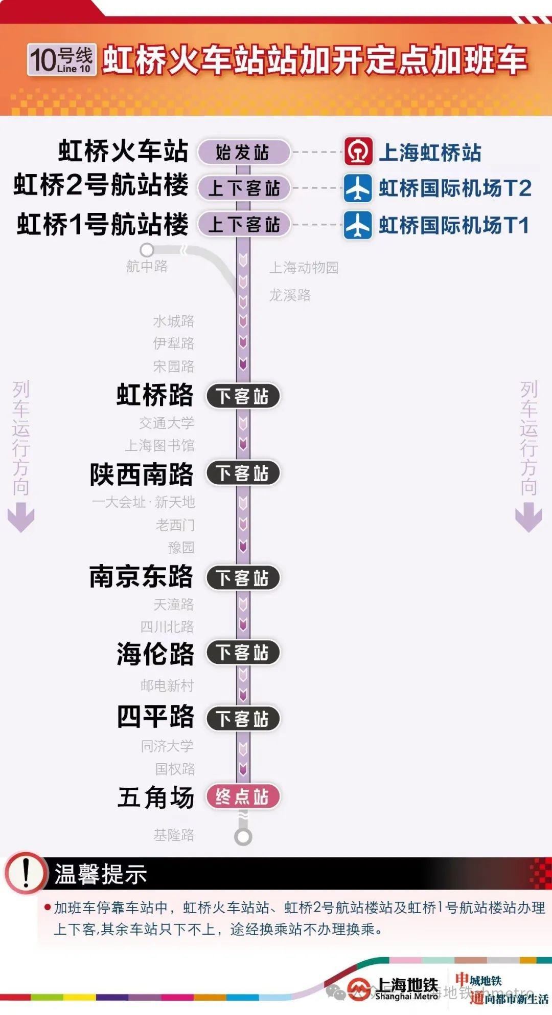 今日,10號(hào)線虹橋火車站加班車延長(zhǎng)至2月18日2:30。其中,10號(hào)線虹橋火車站站往五角場(chǎng)站方向定點(diǎn)加班車沿途僅停靠虹橋火車站站、虹橋2號(hào)航站樓站、虹橋1號(hào)航站樓站、虹橋路站、陜西南路站、南京東路站、海倫路站、四平路站、五角場(chǎng)站,其余車站跳停。??寇囌局校鐦蚧疖囌菊?、虹橋2號(hào)航站樓站、虹橋1號(hào)航站樓站可同時(shí)上下客,其余車站只下不上,途經(jīng)換乘站不可換乘。