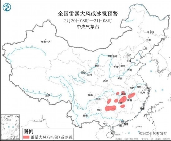 預(yù)計2月20日8時至21日8時,安徽西南部、湖北東部和南部、湖南中北部和西南部、江西中北部、貴州東南部、廣西東北部等地的局地將有8-10級雷暴大風或冰雹天氣;安徽中南部、江蘇西南部、湖北東部、湖南南部和西部、江西北部、廣西東北部等地的部分地區(qū)將有短時強降水天氣,最大小時雨量20-30毫米,局地可達35毫米以上。