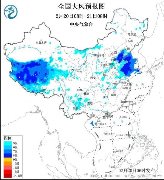 預(yù)計,2月20日8時至21日8時,西藏中西部、青海中南部、內(nèi)蒙古中西部、遼寧南部、華北東南部、黃淮西部和東部、江淮西部和北部等地的部分地區(qū)有5~7級風,陣風8~9級。渤海、渤海海峽、黃海大部海域?qū)⒂?~8級,陣風9~10級的大風。