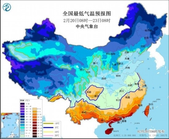 中新網(wǎng)2月20日電 據(jù)中央氣象臺網(wǎng)站消息,中央氣象臺2月20日6時繼續(xù)發(fā)布寒潮橙色預(yù)警:受寒潮影響,預(yù)計,2月20日至2月23日,我國中東部大部將自北向南先后出現(xiàn)降溫,日平均或最低氣溫普遍下降8~12℃,華北南部、黃淮西部、江淮、江漢、江南、華南中北部及貴州等地氣溫將下降12~18℃,其中,湖南南部、貴州東部、廣西北部等地的部分地區(qū)累計降溫幅度可達20℃以上。2月23日前后,最低溫度0℃線將南壓到蘇皖南部至湖南南部、貴州南部一帶。