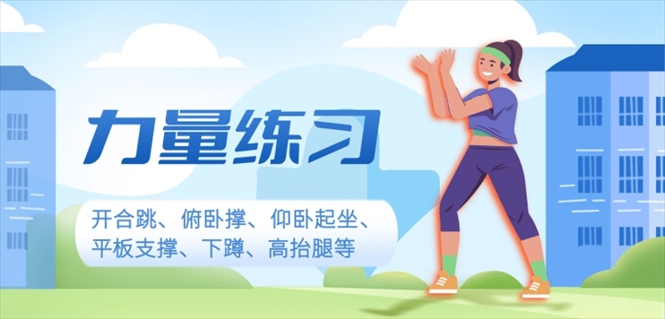 開合跳主要鍛煉下肢和腰腹肌肉力量,主要動作是雙腳往外張開約1.5倍肩寬,雙手往頭頂方向擊掌,手肘盡量伸直,在頭部兩側夾緊,身體向上延伸。