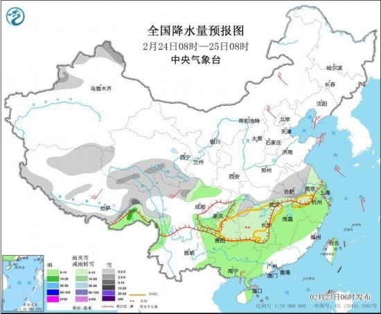 全國(guó)降水量預(yù)報(bào)圖(2月23日8時(shí)-24日8時(shí))