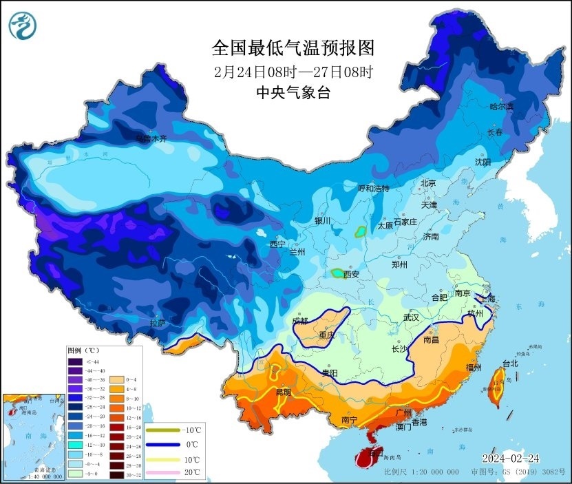 中央氣象臺2月24日06時繼續(xù)發(fā)布低溫黃色預(yù)警: