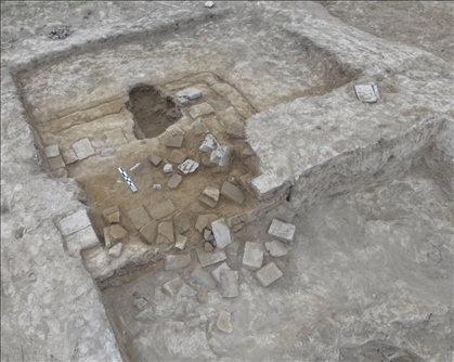 此外,考古隊(duì)員在最大的房址發(fā)現(xiàn)方形磚砌祭臺(tái)。專(zhuān)家表示,磚砌祭臺(tái)屬熱水墓群中的首次發(fā)現(xiàn),祭臺(tái)中發(fā)現(xiàn)大量磚塊。通過(guò)陵園及祭祀建筑的規(guī)模、數(shù)量等線索推測(cè),這個(gè)墓葬的規(guī)格、墓主人的身份等級(jí)要高于2018血渭一號(hào)墓。