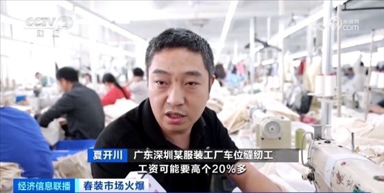 廣東深圳某服裝工廠車位縫紉工 夏開川:比淡季的時候工資可能要高20%多。現(xiàn)在(車位縫紉工)一個月1萬多元。