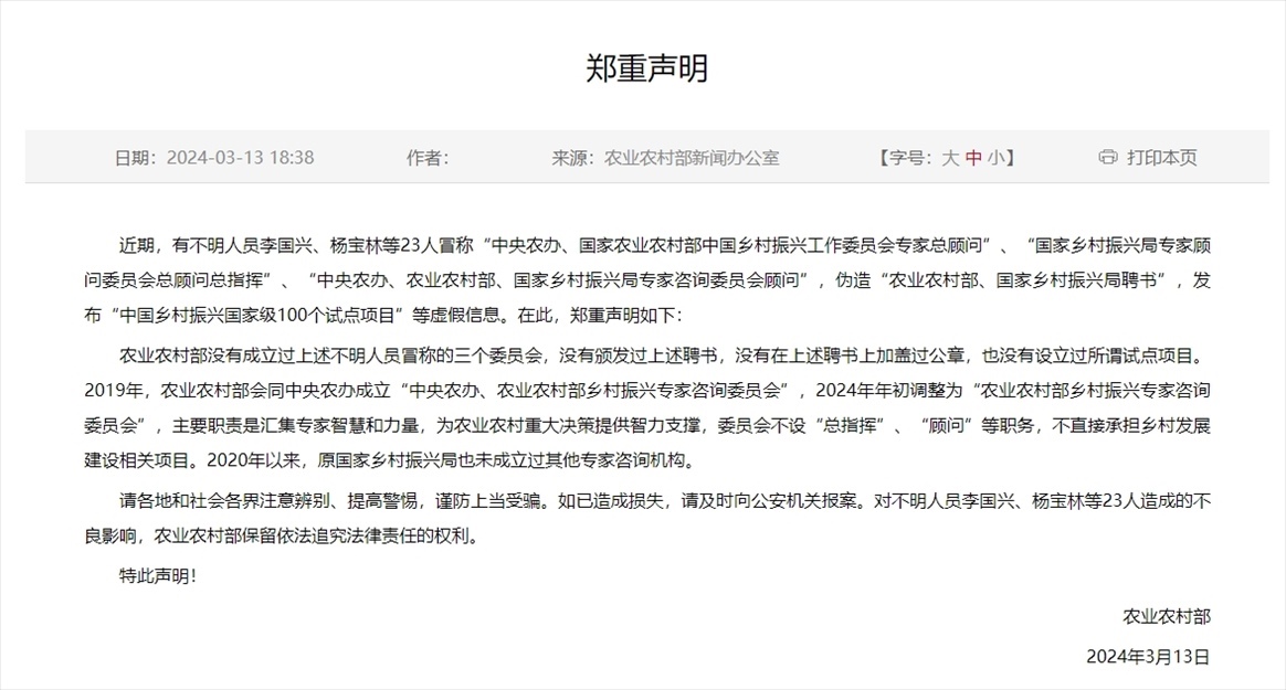 ·農(nóng)業(yè)農(nóng)村部鄭重聲明:沒有成立過不明人員冒稱的“中央農(nóng)辦、國(guó)家農(nóng)業(yè)農(nóng)村部中國(guó)鄉(xiāng)村振興工作委員會(huì)專家總顧問”、“國(guó)家鄉(xiāng)村振興局專家顧問委員會(huì)總顧問總指揮”、“中央農(nóng)辦、農(nóng)業(yè)農(nóng)村部、國(guó)家鄉(xiāng)村振興局專家咨詢委員會(huì)顧問”三個(gè)委員會(huì),沒有頒發(fā)過上述聘書,沒有在上述聘書上加蓋過公章,也沒有設(shè)立過所謂試點(diǎn)項(xiàng)目。