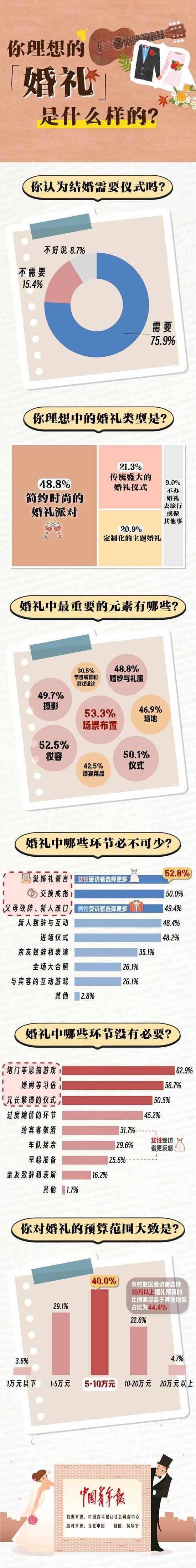 數據顯示,在婚禮中,受訪青年覺得最沒有必要的內容依次是:堵門等惡搞游戲(62.9%)、婚鬧等習俗(56.7%)、冗長繁瑣的儀式(50.5%)。其他還有:過度煽情的環(huán)節(jié)(45.2%),給賓客敬酒(31.7%),車隊接親(29.6%),早起準備(25.6%)等。