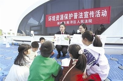 在第三十二屆“世界水日”來臨之際,浙江省湖州市南潯區(qū)人民法院法官走進(jìn)菱湖鎮(zhèn)省級濕地公園,將水資源保護(hù)和生態(tài)環(huán)境保護(hù)的法律知識以接地氣的方式向漁民及周邊游客宣講,并通過猜謎語、貼畫板等形式為小朋友上了一堂水資源保護(hù)法治課,形成良好的法治宣傳氛圍。圖為法官給小朋友上水資源保護(hù)法治課。