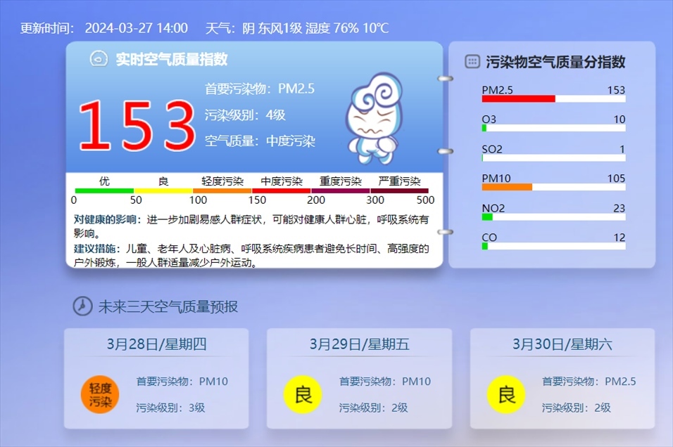 央視網消息:據@北京環(huán)境監(jiān)測 消息,3月27日14時,北京實時空氣質量為中度污染,首要污染物為PM2.5,污染級別4級。