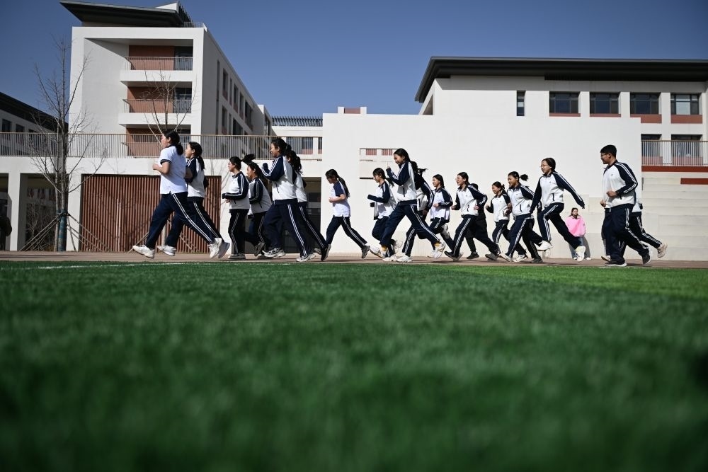 ↑3月29日,北京四中雄安校區(qū)的學生在操場上跑步。