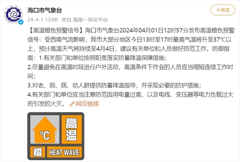 央視網(wǎng)消息:據(jù)@海口市氣象臺 微博消息,??谑袣庀笈_2024年04月01日12時57分發(fā)布高溫橙色預(yù)警信號:受西南氣流影響,??谑写蟛糠值貐^(qū)今日13時至17時最高氣溫將升至37℃以上,預(yù)計高溫天氣將持續(xù)至4月4日,建議有關(guān)單位和人員做好防范工作。