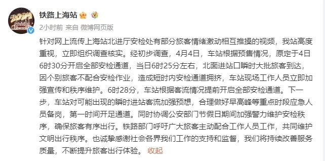 央視網(wǎng)消息:據(jù)@鐵路上海站 消息,針對(duì)網(wǎng)上流傳上海站北進(jìn)廳安檢處有部分旅客情緒激動(dòng)相互推搡的視頻,車站高度重視,立即組織調(diào)查核實(shí)。經(jīng)初步調(diào)查,4月4日,車站根據(jù)預(yù)售情況,原定于4日6時(shí)30分開(kāi)啟全部安檢通道,當(dāng)日6時(shí)25分左右,北面進(jìn)站口瞬時(shí)大批旅客到達(dá),因個(gè)別旅客不配合安檢作業(yè),造成短時(shí)內(nèi)安檢通道擁擠,車站現(xiàn)場(chǎng)工作人員立即加強(qiáng)宣傳和秩序維護(hù)。6時(shí)28分,車站根據(jù)客流情況提前開(kāi)啟全部安檢通道。下一步,車站對(duì)可能出現(xiàn)的瞬時(shí)進(jìn)站客流加強(qiáng)預(yù)想,合理做好早高峰等重點(diǎn)時(shí)段應(yīng)急人員備崗,第一時(shí)間開(kāi)足通道。同時(shí)協(xié)調(diào)公安部門節(jié)假日期間加強(qiáng)警力維護(hù)安檢秩序,確保旅客有序出行。鐵路部門呼吁廣大旅客主動(dòng)配合工作人員工作,共同維護(hù)文明出行秩序,也誠(chéng)摯感謝社會(huì)各界對(duì)其工作的支持和監(jiān)督,將持續(xù)改善服務(wù)質(zhì)量,不斷提升旅客出行體驗(yàn)。