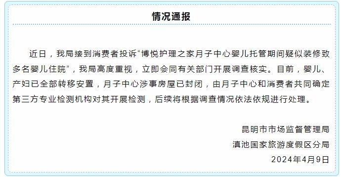 央視網(wǎng)消息:據(jù)“滇池度假發(fā)布”官微消息,昆明市市場監(jiān)督管理局滇池國家旅游度假區(qū)分局通報,近日,該局接到消費者投訴“博悅護(hù)理之家月子中心嬰兒托管期間疑似裝修致多名嬰兒住院”,該局高度重視,立即會同有關(guān)部門開展調(diào)查核實。目前,嬰兒、產(chǎn)婦已全部轉(zhuǎn)移安置,月子中心涉事房屋已封閉,由月子中心和消費者共同確定第三方專業(yè)檢測機(jī)構(gòu)對其開展檢測,后續(xù)將根據(jù)調(diào)查情況依法依規(guī)進(jìn)行處理。