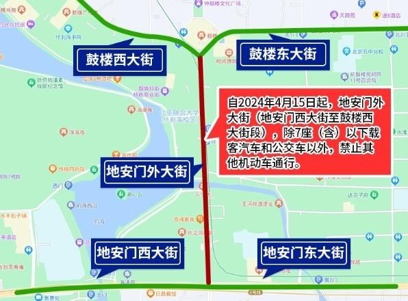 為確保全國重點(diǎn)文物保護(hù)單位“大運(yùn)河——玉河故道(澄清上閘含萬寧橋)”的文物安全與交通安全,根據(jù)文物保護(hù)和道路交通安全有關(guān)法律法規(guī)規(guī)定,決定自2024年4月15日起,地安門外大街(地安門西大街至鼓樓西大街段),除7座(含)以下載客汽車和公交車以外,禁止其他機(jī)動(dòng)車通行。
