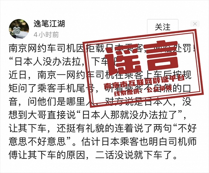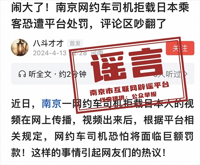 央視網(wǎng)消息:南京網(wǎng)絡(luò)辟謠官微消息,近日,網(wǎng)上流傳“一名日本游客在南京使用網(wǎng)約車服務(wù)時(shí),遭遇司機(jī)拒載”的消息,并配有車內(nèi)監(jiān)控畫面。有自媒體捏造稱,南京市交通局發(fā)布了緊急通告,表示將對涉事網(wǎng)約車司機(jī)進(jìn)行嚴(yán)肅處理。一時(shí)之間,引發(fā)不少評(píng)論和爭議。