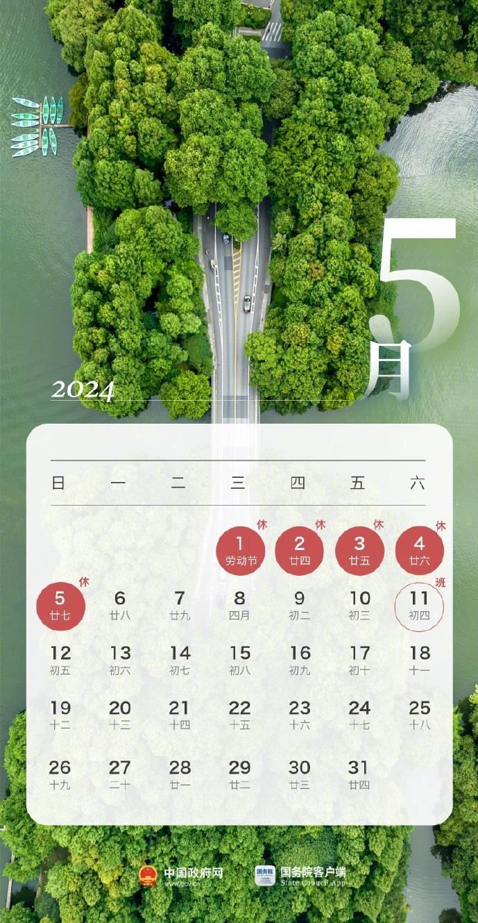 根據(jù)國務(wù)院辦公廳通知精神,2024年勞動節(jié)放假安排為:5月1日(星期三)至5月5日(星期日)放假調(diào)休,共5天。4月28日(星期日)、5月11日(星期六)上班。