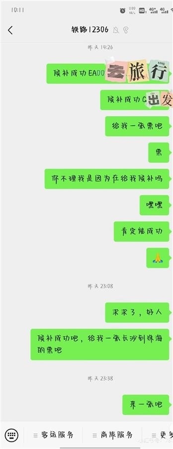“你不理我是因?yàn)樵诮o我候補(bǔ)嗎”“親愛的我要票”……另一名網(wǎng)友也發(fā)帖稱,自己使用向12306微信公眾號“發(fā)瘋”的辦法,成功候補(bǔ)到了車票,其發(fā)布的網(wǎng)帖題為“適當(dāng)發(fā)瘋候補(bǔ)成功”。