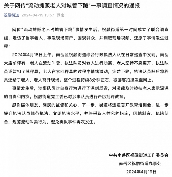 央視網消息:4月19日,衡陽南岳區(qū)祝融街道辦事處發(fā)布關于網傳“流動攤販老人對城管下跪”一事調查情況的通報。