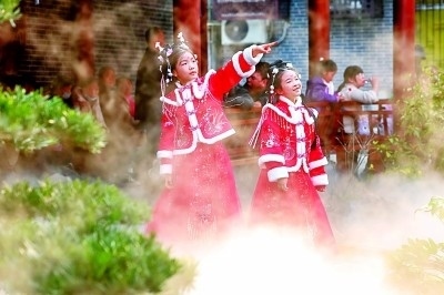 夜幕降臨后,襄陽(yáng)古城迎來(lái)了一天最具魅力的時(shí)刻。漫步在店鋪林立、游人如織的北街上,遠(yuǎn)處巍峨聳立的昭明臺(tái)燈火輝煌,全長(zhǎng)1200多米的寬闊街道上,一座座石牌坊坐落其間,兩側(cè)雅致的青磚馬頭墻、明艷的朱紅立柱、優(yōu)美的墀頭朱雀,展示著古老而又時(shí)尚的文化韻味。在北街循著巷子?xùn)|行,便來(lái)到了新近開放的管家巷歷史文化商業(yè)街區(qū)。在襄音廣場(chǎng),隨著音樂(lè)聲響起,年輕的演員們與游客共同跳起歡快的舞蹈。管家巷文化休閑街區(qū)運(yùn)營(yíng)負(fù)責(zé)人劉洋介紹:“《詩(shī)畫襄陽(yáng)》《俠義襄陽(yáng)》《舞墨襄陽(yáng)》等10部極具襄陽(yáng)韻味的特色劇目,在管家巷全程免費(fèi)開放,劉備、諸葛亮、李白、杜甫、孟浩然等30多位歷史名人的扮演者,走街串巷、演藝互動(dòng),游客仿佛穿越至千年前的襄陽(yáng)?!?/p>