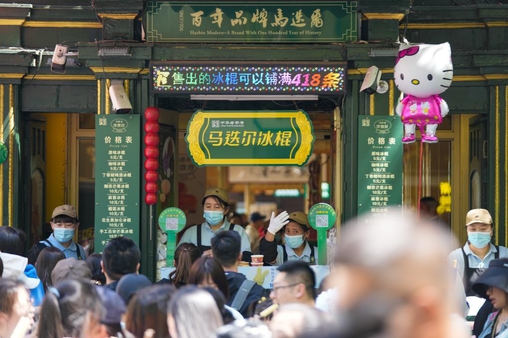 5月1日,在哈爾濱中央大街上,馬迭爾冰棍的銷(xiāo)售人員在招攬顧客。新華社記者 王建威 攝