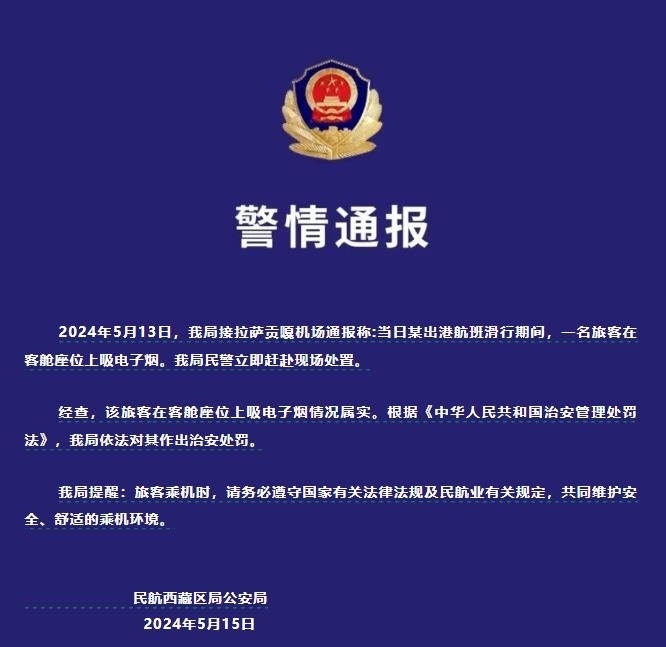 央視網(wǎng)消息:據(jù)民航西藏自治區(qū)管理局公眾號(hào)消息,5月15日,民航西藏區(qū)局公安局發(fā)布警情通報(bào)稱,5月13日,拉薩貢嘎機(jī)場某出港航班滑行期間,一名旅客在客艙座位上吸電子煙,民航西藏區(qū)局公安局民警立即趕赴現(xiàn)場處置。
