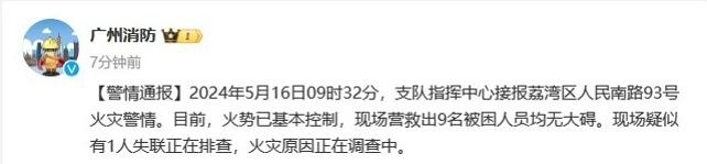 央視網消息:據(jù)廣州消防微博消息,2024年5月16日09時32分,廣州市消防支隊指揮中心接報荔灣區(qū)人民南路93號火災警情。目前,火勢已基本控制,現(xiàn)場營救出9名被困人員均無大礙?,F(xiàn)場疑似有1人失聯(lián)正在排查,火災原因正在調查中。
