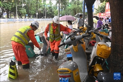 5月19日,工作人員在南寧東葛路開展排水作業(yè)。新華社記者 陸波岸 攝
