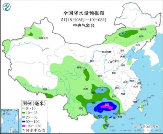 5月18日08時(shí)至19日08時(shí),內(nèi)蒙古東南部、江南南部和西部、重慶中西部、西南地區(qū)東南部、華南大部等地部分地區(qū)有中到大雨,其中,湖南南部、貴州東南部、廣西中北部及南部沿海、廣東西北部及南部沿海等地部分地區(qū)有暴雨或大暴雨(100~210毫米);西藏東部、青海中東部、川西高原等地的部分地區(qū)有中到大雪(雨或雨夾雪)。內(nèi)蒙古中部、黑龍江東北部、新疆南疆盆地等地部分地區(qū)有4~6級(jí)風(fēng)(見圖2)。