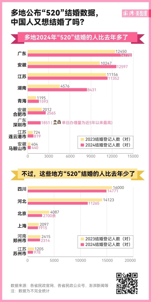2023 年多地“520”領(lǐng)證人數(shù)下跌,引起熱議。2024 年的“520”剛剛過(guò)去,多地披露了當(dāng)日結(jié)婚登記數(shù)。廣東、安徽、江蘇等省當(dāng)日領(lǐng)證人數(shù)較去年有回升。澎湃新聞從深圳市民政局獲悉,截至 5 月 20 日 18 時(shí) 30 分,“520”全天共辦理結(jié)婚登記 1851 對(duì),單日辦理量為近 5 年以來(lái)最高。中國(guó)人又重燃對(duì)婚姻的渴望了嗎?