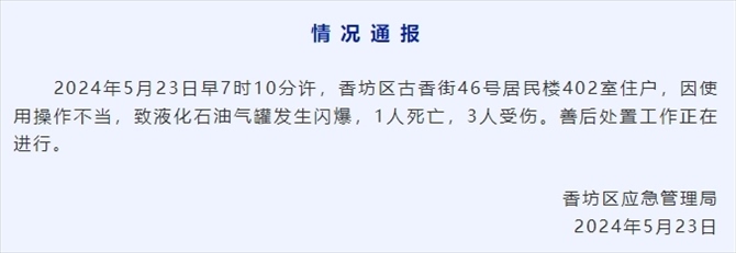 央視網消息:哈爾濱市香坊區(qū)應急管理局發(fā)布情況通報,2024年5月23日早7時10分許,香坊區(qū)古香街46號居民樓402室住戶,因使用操作不當,致液化石油氣罐發(fā)生閃爆,1人死亡,3人受傷。善后處置工作正在進行。
