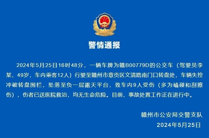 央視網(wǎng)消息:據(jù)贛州公安微信公眾號(hào)消息,2024年5月25日16時(shí)48分,一輛車牌為贛B00779D的公交車(駕駛員李某,49歲,車內(nèi)乘客12人)行駛至贛州市章貢區(qū)文清路南門口轉(zhuǎn)盤(pán)處,車輛失控沖破轉(zhuǎn)盤(pán)圍欄,墜落至負(fù)一層露天平臺(tái),致車內(nèi)9人受傷(多為磕碰和刮擦傷),傷者已送醫(yī)院救治,均無(wú)生命危險(xiǎn)。目前,事故處置工作正在進(jìn)行中。