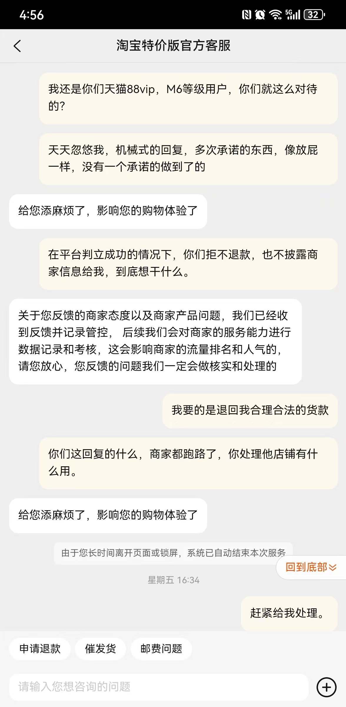李女士:(客服)剛開(kāi)始說(shuō)讓我等24小時(shí)說(shuō)平臺(tái)只要介入了,不需要買(mǎi)家同意就可以退款。然后就說(shuō)等48小時(shí),后來(lái)又說(shuō)等7天,再后來(lái)他就直接給我這么說(shuō)的,你再打也沒(méi)用,這個(gè)已經(jīng)是最終的處理結(jié)果了。