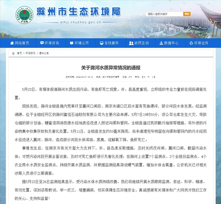 現(xiàn)場發(fā)現(xiàn),滁河全椒縣境內(nèi)荒草圩至襄河口閘段、南京市浦口區(qū)段水面有死魚漂浮,部分河段水體發(fā)黑。經(jīng)監(jiān)測溯源,位于全椒經(jīng)開區(qū)的滁州富信石油助劑有限公司為主要污染來源。5月7日19時50分,該公司倉庫發(fā)生火災(zāi),導(dǎo)致倉儲的部分甘油、糖蜜連同消防廢水經(jīng)地表徑流進入附近溝渠和管網(wǎng)。全椒縣通過筑壩截污抽排等措施,將外泄的污染物集中收集存放和無害化處置。5月11日,全椒縣發(fā)生約50毫米降雨,尚未清理完畢殘留在溝渠和管網(wǎng)內(nèi)的污水經(jīng)雨水徑流進入襄河、滁河,造成部分河段水體渾濁、黑臭,溶解氧下降,魚蝦死亡。公安機關(guān)已對相關(guān)涉案人員進行立案調(diào)查。