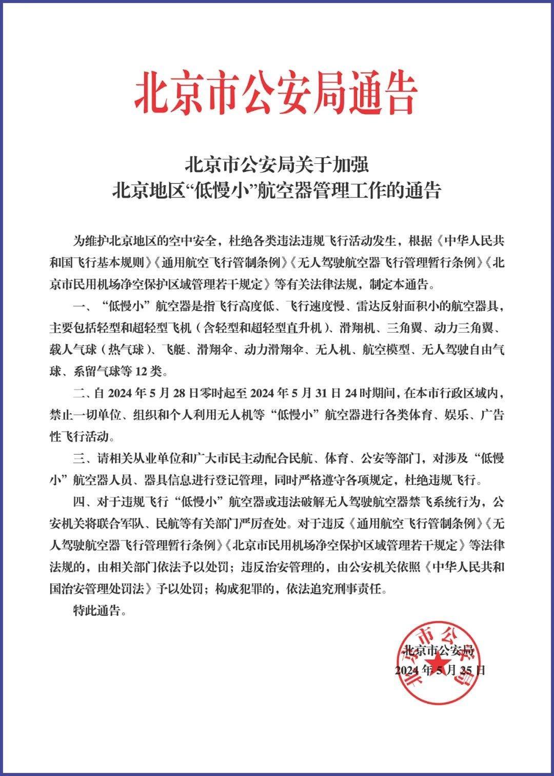 央視網(wǎng)消息:據(jù)“首都治安微提示”公眾號(hào)消息,5月25日,北京市公安局發(fā)布了《北京市公安局關(guān)于加強(qiáng)北京地區(qū)“低慢小”航空器管理工作的通告》,其中明確:自2024年5月28日零時(shí)起至2024年5月31日24時(shí)期間,在北京市行政區(qū)域內(nèi),禁止一切單位、組織和個(gè)人利用無(wú)人機(jī)等“低慢小”航空器進(jìn)行各類體育、娛樂(lè)、廣告性飛行活動(dòng)。