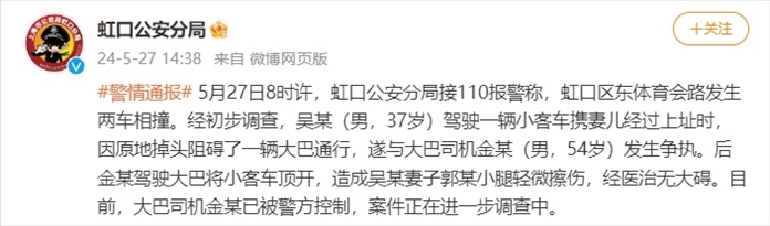 央視網(wǎng)消息:上海市公安局虹口分局發(fā)布警情通報(bào),5月27日8時(shí)許,虹口公安分局接110報(bào)警稱,虹口區(qū)東體育會(huì)路發(fā)生兩車相撞。經(jīng)初步調(diào)查,吳某(男,37歲)駕駛一輛小客車攜妻兒經(jīng)過上址時(shí),因原地掉頭阻礙了一輛大巴通行,遂與大巴司機(jī)金某(男,54歲)發(fā)生爭(zhēng)執(zhí)。后金某駕駛大巴將小客車頂開,造成吳某妻子郭某小腿輕微擦傷,經(jīng)醫(yī)治無大礙。目前,大巴司機(jī)金某已被警方控制,案件正在進(jìn)一步調(diào)查中。