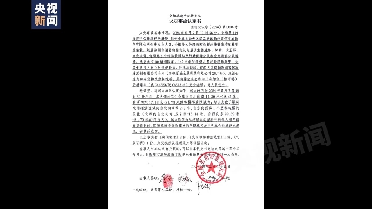 記者從全椒縣消防救援大隊于5月24日出具的火災(zāi)事故認定書上發(fā)現(xiàn),5月7日晚上7點多,滁州富信助劑有限公司倉庫發(fā)生火災(zāi),滁州市消防救援支隊調(diào)集30輛消防車、140名消防救援人員現(xiàn)場處置,火災(zāi)于5月8日0時許撲滅。經(jīng)現(xiàn)場勘驗,該起火災(zāi)燒損滁州富信石油助劑有限公司倉庫、燒毀倉庫內(nèi)部分貨物及塑料噸桶,并將停放在倉庫內(nèi)正在卸粗甲醇的槽罐車完全燒毀,無人員傷亡。