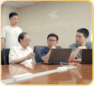 姚期智(左二)在和同學(xué)們交流科研進(jìn)展。以上圖片均為清華大學(xué)黨委宣傳部提供