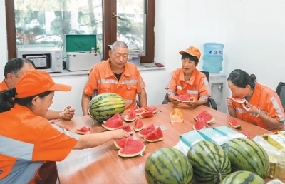 6月11日,山東省濟(jì)南市繼續(xù)發(fā)布高溫紅色預(yù)警信號(hào)。為應(yīng)對(duì)持續(xù)高溫天氣,濟(jì)南市城管部門采取調(diào)整作業(yè)時(shí)間、配發(fā)防暑降溫物品、增加歇腳點(diǎn)等措施,保障環(huán)衛(wèi)工人健康。圖為環(huán)衛(wèi)工人在濟(jì)南市槐蔭區(qū)一處歇腳點(diǎn)內(nèi)休息。新華社記者 朱 崢攝